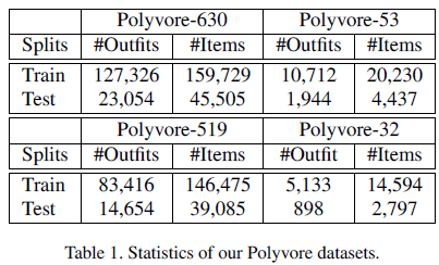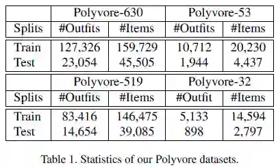 由于现有的数据集要么太小,要么缺少用户信息,都不适用于个性化时尚推荐场景,因此作者从Polyvore网站上收集了一个新数据集,数据集信息如表1所示:对于负样本的选取:1)物品的随机组合2)其他用户正样本的随机采样
