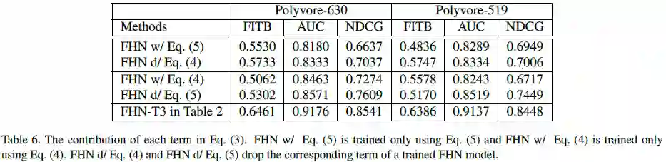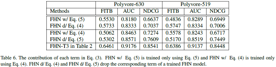 为了验证用户对于物品的偏好和物品之间的兼容性这两组件是否对于模型性能提升有帮助,作者进行了退化实验,如表6所示。实验发现所有的退化模型相比论文提出的完整的模型性能都要差,说明这两组件缺一不可。