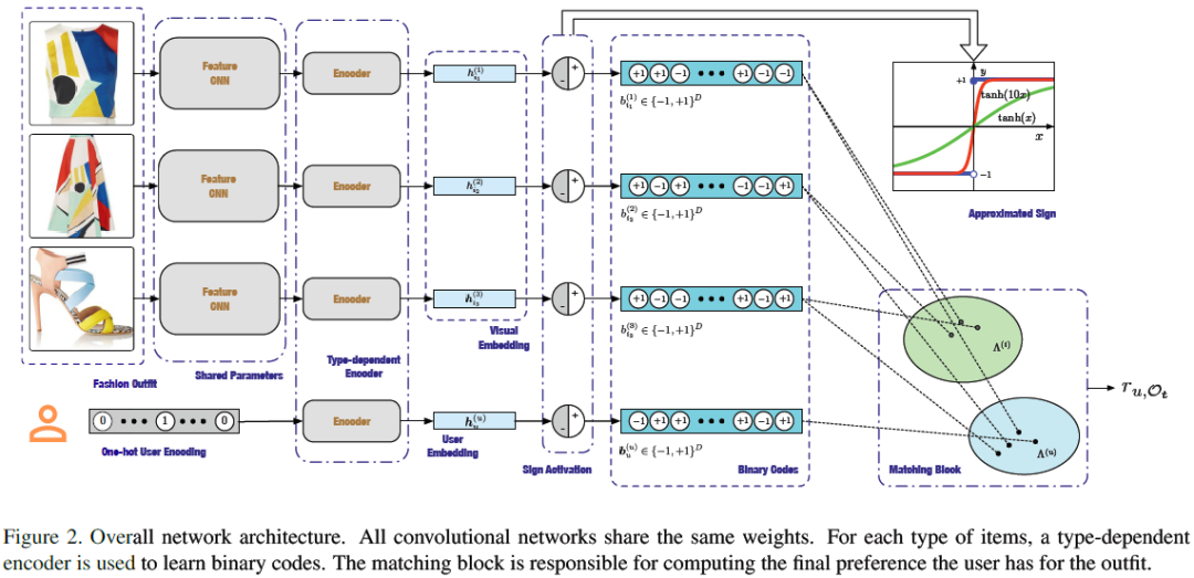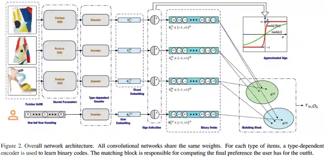 下图为论文所提模型的整体框架图,其中有三个重要模块:1)用来提取特征的特征网络(Feature network)2)学习哈希码的类型依赖的哈希模块(Hashing modules)3)预测偏好分数的打分模块(The matching block)。
