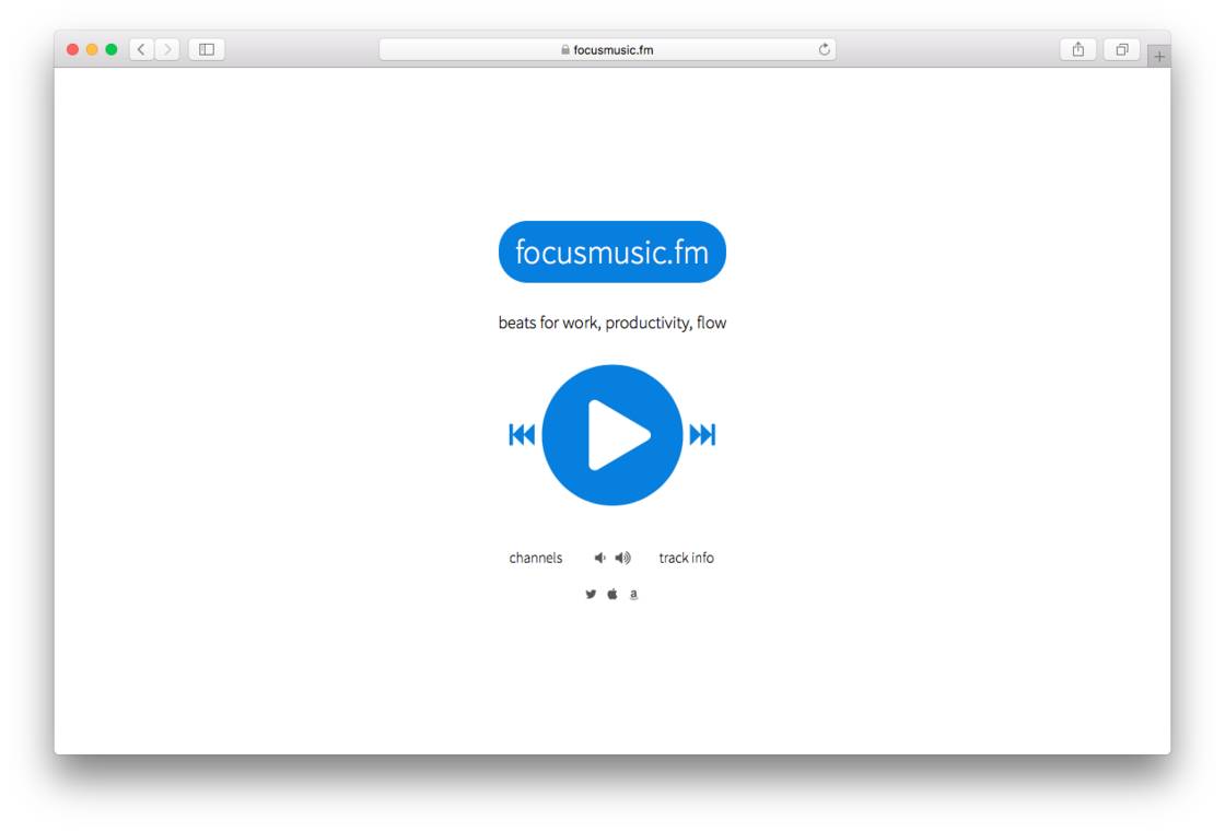 @yunyang088:focusmusic 如其名,它吸引我的地方就是不用思考要听什么,页面大大的播放按钮,点击就可以感受它带来的魅力,之后只要专注手头的工作就好。 focusmusic 还提供了 4 个 Channel:电子、缓拍、经典、白噪音雨声。