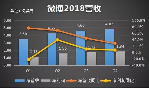一个很明显的趋势是:2017 年微博营收的各季度增长在不断提速越跑越快,而其 2018 年的增长则在逐季度降温萎缩。2017Q1 其净营收同比增长为 0.799 亿美元,Q4 同比增长已经拉大到 1.647 亿美元。同样的数据在 2018 年 Q1 为 1.507 亿美元,到了 Q4 反而缩至 1.045 亿。