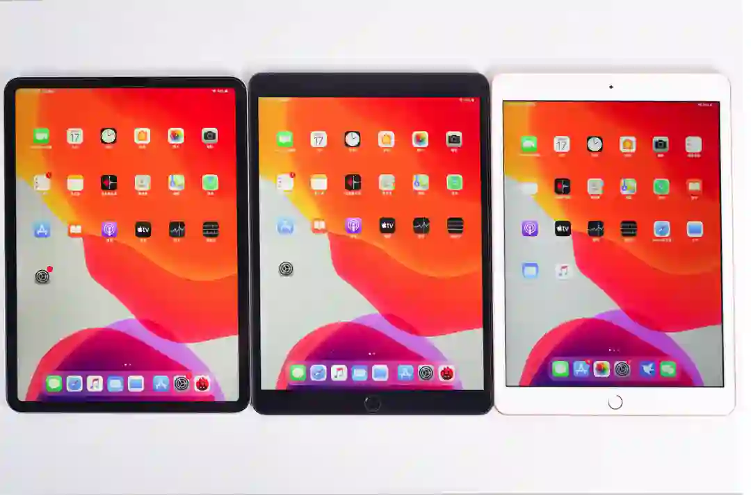 屏幕尺寸先来一张对比图,从左到右分别是 6.1 寸的 iPhone 11、7.9 寸的 iPad mini 5、10.2 寸的 iPad 2019、10.5 寸的 iPad air3 以及 11 寸和 12.9 寸的 iPad pro。