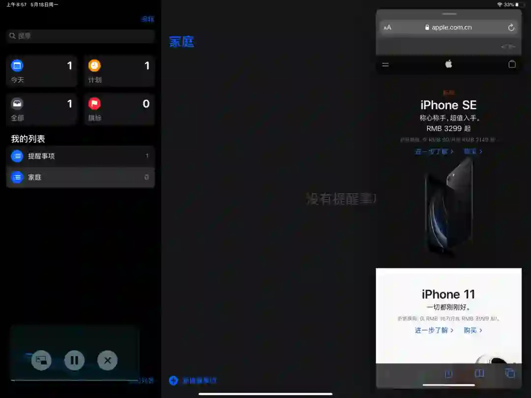 这一次在 iPad OS 中基本上所有的系统级别应用都可以支持双开,并且当后台有多个 APP 运行的时候,通过滑动分屏应用的底部,就可以在多个应用中来回切换。