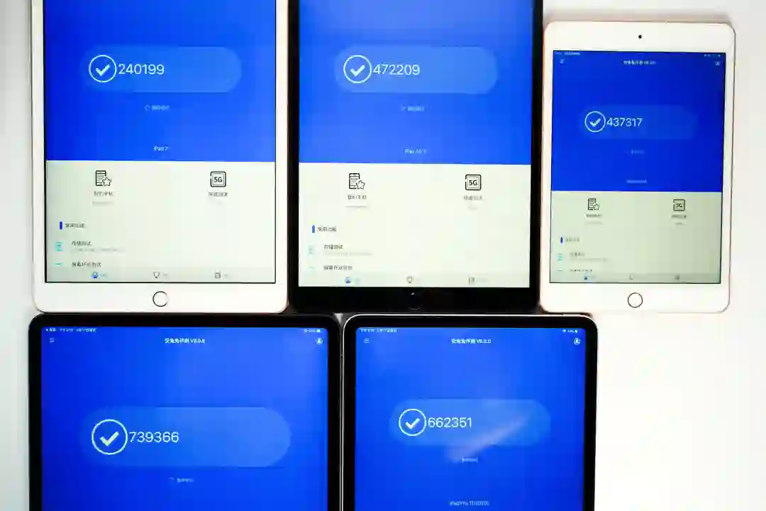 两款 iPad Pro 采用了地表最强移动端处理器 A12Z 处理器,iPad mini5 以及 iPad Air3 都采用了前年的旗舰处理 A12,仅有 iPad 2019 依旧用的是 A10 处理器。跑分如图,最新的 iPad Pro12.9 寸以 73W 的跑分,相比 24W 的 iPad 2019 24W 分整整高了两倍。