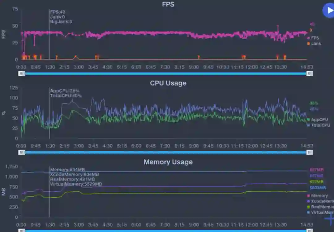 有趣的是,虽然系统设置的是 90 帧,但是通过帧率测试软件居然测得了 120 帧,并且 iPad Pro 的表现良好,基本上都是一直维持 90-120 帧之间浮动。虽然拥有强大的性能,不过我认为 iPad Pro 真的不适合举在手里玩和平精英~