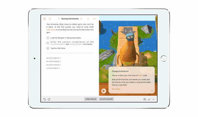 苹果还开发了Swift Playgrounds应用程序, 用游戏化的方式,让入门学习变得充满趣味、互动十足。