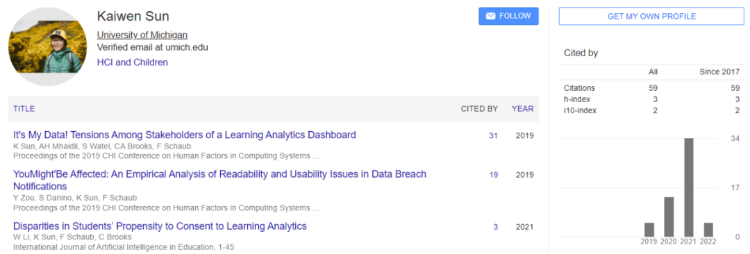 Kaiwen Sun 是密歇根大学信息学院的博士生,其导师为 Florian Schaub 博士和 Chris Brooks 博士。她的研究重点是通过设计和开发以儿童为中心的功能和控件,以在智能家居技术的环境下理解和支持儿童的隐私和安全需求。