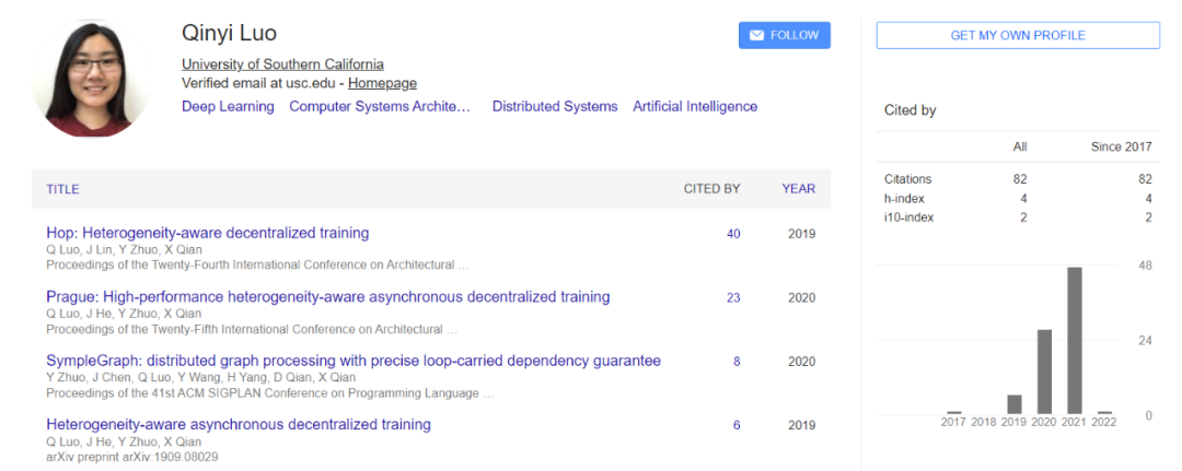 骆沁毅本科就读于清华大学,现在是南加州大学计算机科学专业的博士生,师从钱学海博士,研究兴趣主要集中在机器学习的高性能分布式训练系统等方面,尤其是新型并行化和同步化方法的开发。