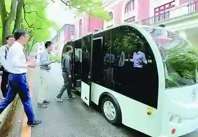 乘客在上海交通大学校园内体验实验性运行的无人驾驶小巴