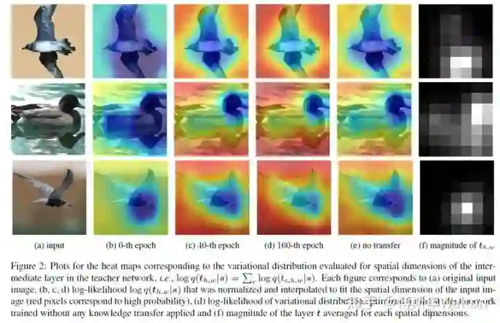图a是输入图像,图(b,c和d)是不同训练epoch下的student网络和teacher网络variational distribution的密度heat map变化,观察到学生网络通过训练,根据教师网络去估计中间层的密度分布;