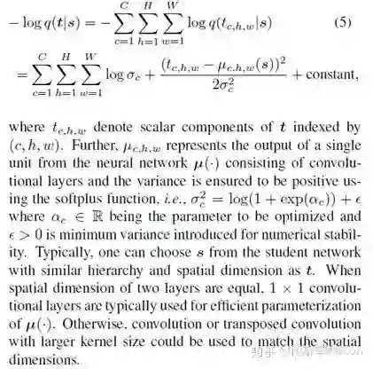 t代表教师网络的中间层,s代表相对应的student网络的中间层,c,h,w分别对应channel,height,width;q(t|s)是variational distribution变异分布,公式如图所示,是一个高斯均方差分布和标准差之和。