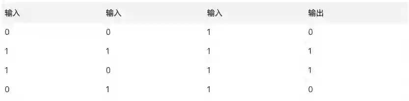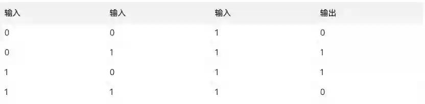 那么,模式是什么呢?看起来结果完全和第三列无关,这一列的值永远是1. 然而,第1列和第2列组合起来看比较清楚。如果第1列和第2列有一列是1(但两列不同为1!),那么输出是1. 这是我们的模式。