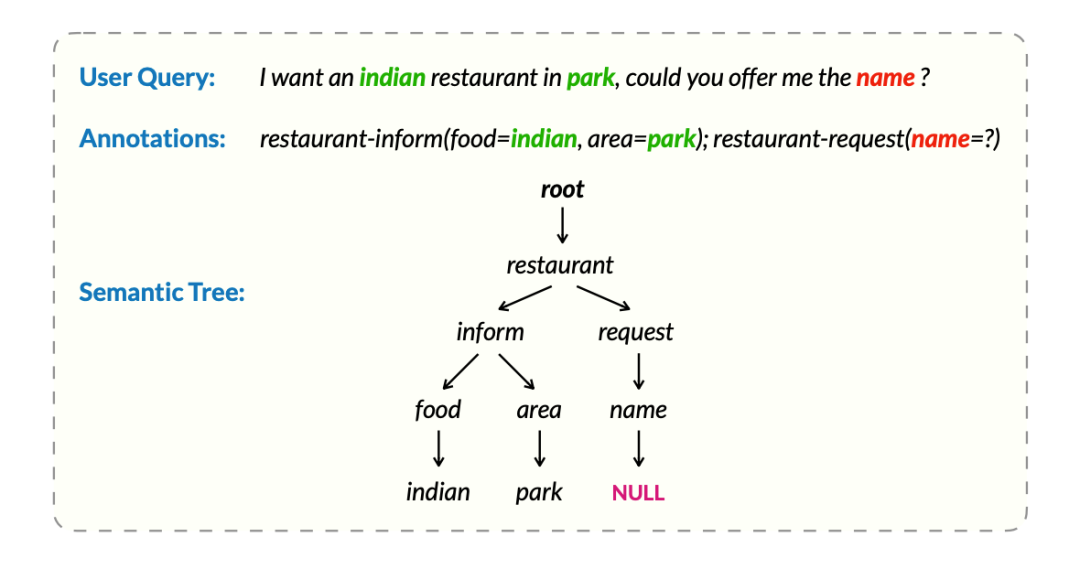 如此的语义标注信息自然地能够展开为一棵半结构化的多叉树,这里我们将它称为语义树。一棵标准的语义树通常包含四层结构:领域层,意图层,词槽层和实体层。每层都把语义标注中的相应成分视作该层的节点。如果其中某层没有相应的标注信息提供,那么该层的节点将被置为空节点 (NULL)。具体来说,语义树第一层由域节点组成,作为根节点 (root) 的后继节点和意图节点的前驱节点。词槽节点占据语义树的第三层,同时作为意图节点的孩子节点和词槽节点的父节点。最后,实体节点作为叶子节点占据语义树的最后一层。