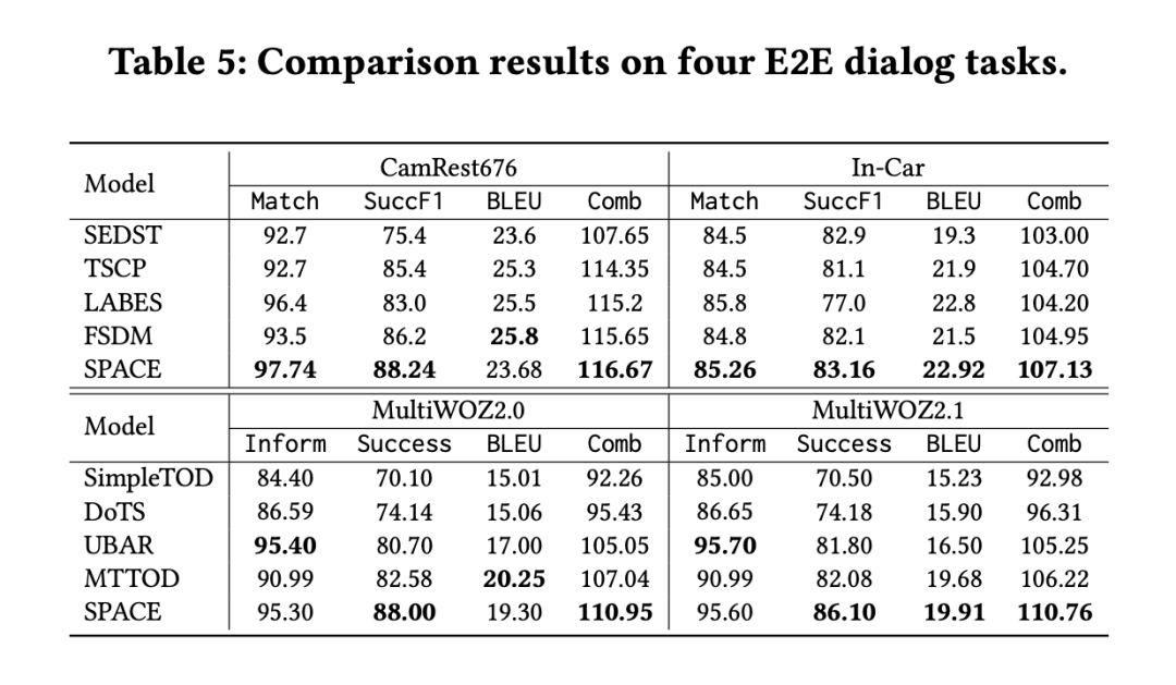 实验结果表明,SPACE 在下游 3 类任务型对话任务(意图识别、对话状态追踪、端到端对话建模),共计 8 个数据集(BANKING77,CLINC150,HWU64,CamRest,In-Car Assistant, MultiWOZ2.0/2.1/2.2)上均取得了 SOTA 性能。