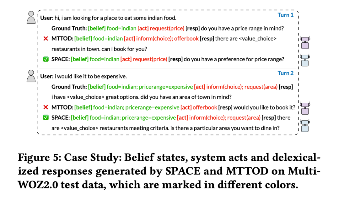 如下图所示,我们直观的展示了 SPACE 模型和其他 baseline 模型在端到端对话生成任务上的生成结果。从对比中可以看出,我们的 SPACE 模型可以在前两轮对话中选择了正确的对话动作,以致于整体对话可以朝着完成任务的正确方向进行延续,也验证了我们的模型具有很强的策略规划和回复生成的能力。