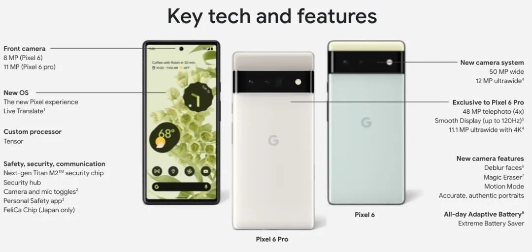 赶在 10 月 20 日凌晨 1 点的发布会之前,Pixel 6 系列的信息已经通过曝光的宣传页面、参数列表悉数列出。今年 Pixel 6 系列将包含 Pixel 6、Pixel 6 Pro 两款机型,Pixel 6 搭载 6.4 英寸 90Hz 高刷屏,2340x1080 分辨率;Pixel 6 Pro 搭载 6.7 英寸 120Hz LTPO 面板高刷屏,支持自适应刷新率,分辨率为 3120x1440。