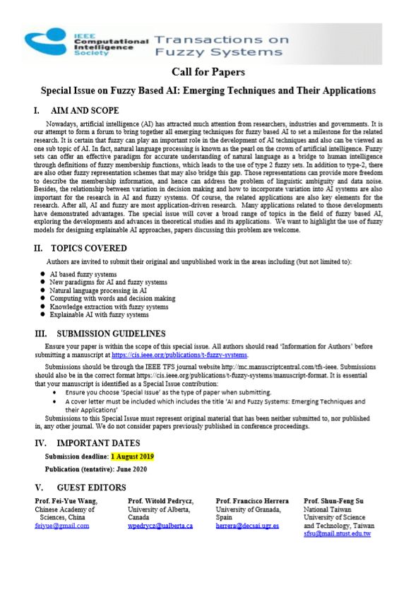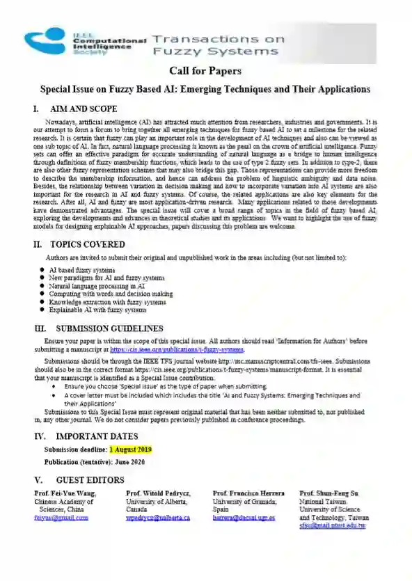 欢迎向IEEE模糊系统汇刊(本领域最好的学术期刊之一)“基于模糊的人工智能”专刊投稿!