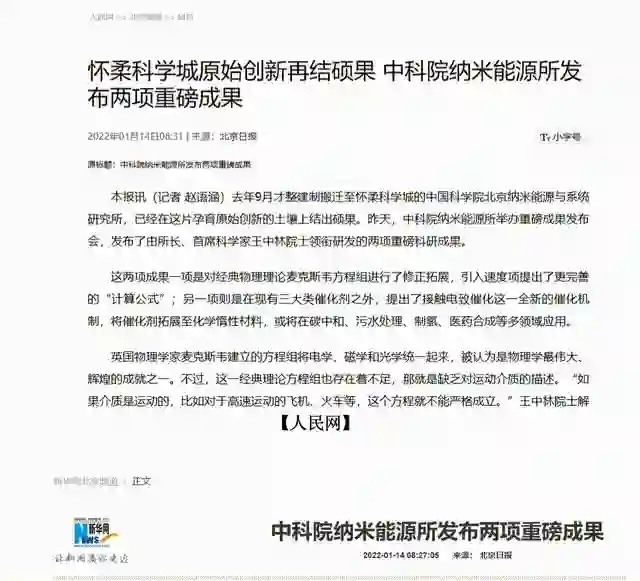 近日,中国科学院北京纳米能源与系统研究所召开新闻发布会。会上外籍院士王中林表示,他经过数年研究和实验验证,对麦克斯韦方程组进行了成功拓展。