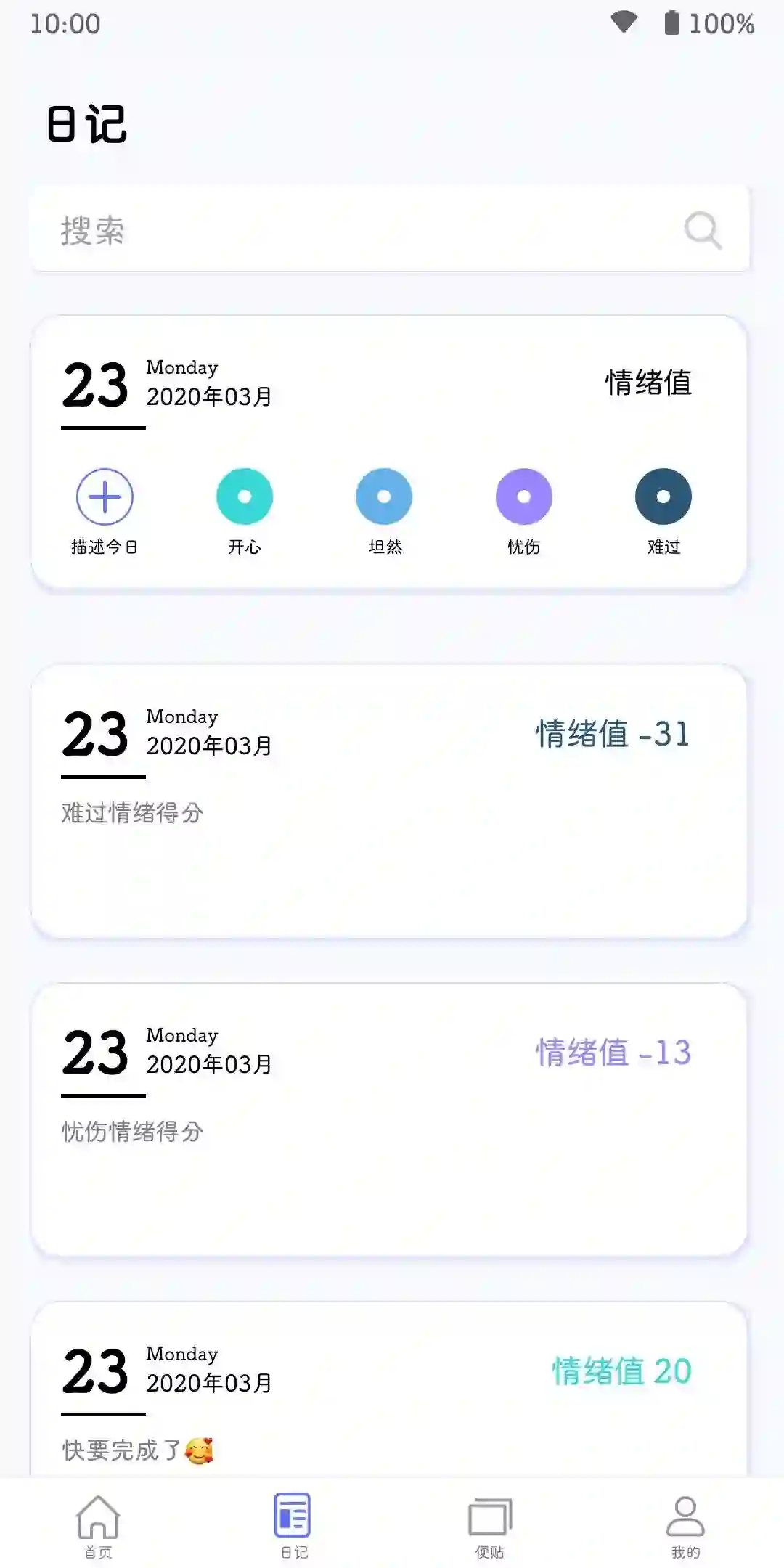 相比于其他日记类 app,今天介绍的这款无忧日记更加注重「情绪」记录,根据用户所选择的情绪不同,最终得到的情绪值也会不同,正性情绪记录为正值,负性情绪则记录为负值,最终情绪值会以每日情绪报表的形式展示在首页,方便用户了解自己的情绪波动状况。