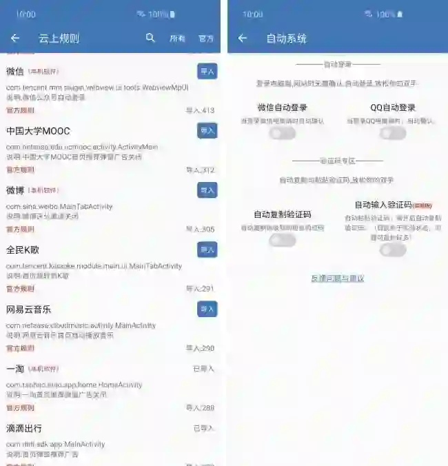 除了用户手动添加规则,Auto tool 还内置了一个规则分享平台,对于尚未在该应用内适配的 App,官方或其他用户可以在平台内分享规则,相比其他产品需要更新 App 进行适配的方式更加迅速,而这种方式也让 Auto tool 不局限于跳过「开屏广告」,例如关闭 B 站客户端青少年模式提示、关闭微博瀑布流广告甚至打开网易云自动点击播放按钮,Auto tool 都可以凭借云上规则完成。不过目前规则数量较少,需要开发者和用户持续分享。