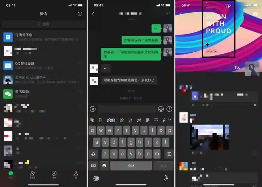 🕵🏻 Tp:万众期待的 微信深色模式终于上线 了。微信的深色模式并不是单纯「换个黑色主题」这么简单,而是深灰色背景 + 浅灰色菜单。聊天界面也针对深色模式进行了优化,即使你使用的是自定义背景,微信也会自动为你降低背景亮度。