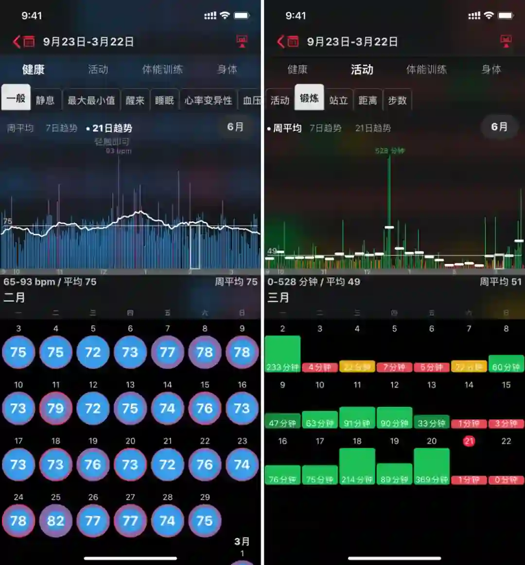 相比于系统自带的健康应用,HeartWatch 支持对心率、血压、睡眠、体能训练等数据的多维度分析和数据可视化,并支持最多查看 12 个月的历史数据趋势。