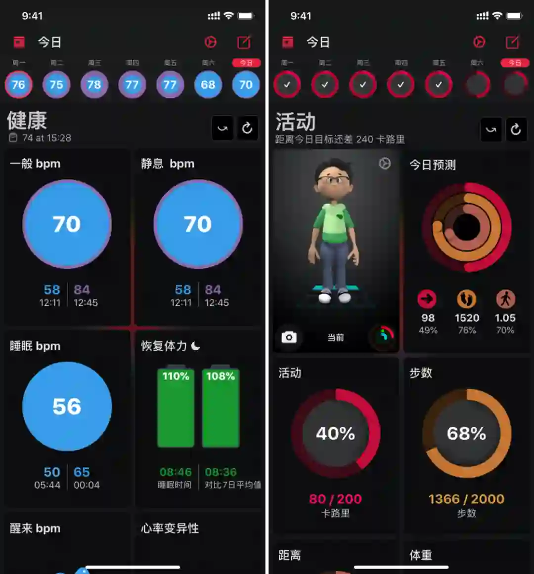 新的 HeartWatch 4 采用了全新的 UI / UX 设计,首页中的每一项数据均以卡片呈现,并可以通过手势翻转查看不同类型的可视化图表。整体更加简洁,动效更加流畅。