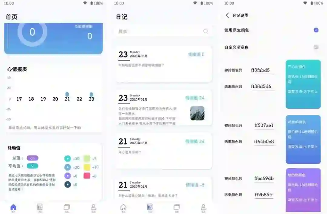无忧日记的界面设计给人以干净、清新的感觉,主要内容均以卡片形式展现优点是更加整洁有序,缺点则是一屏之内可容纳的有效信息减少。无忧日记的日记背景支持自定义渐变色,不同的颜色体现了不同的情绪状态,我们可以根据自己的喜好搭配出一套独特的情绪色。