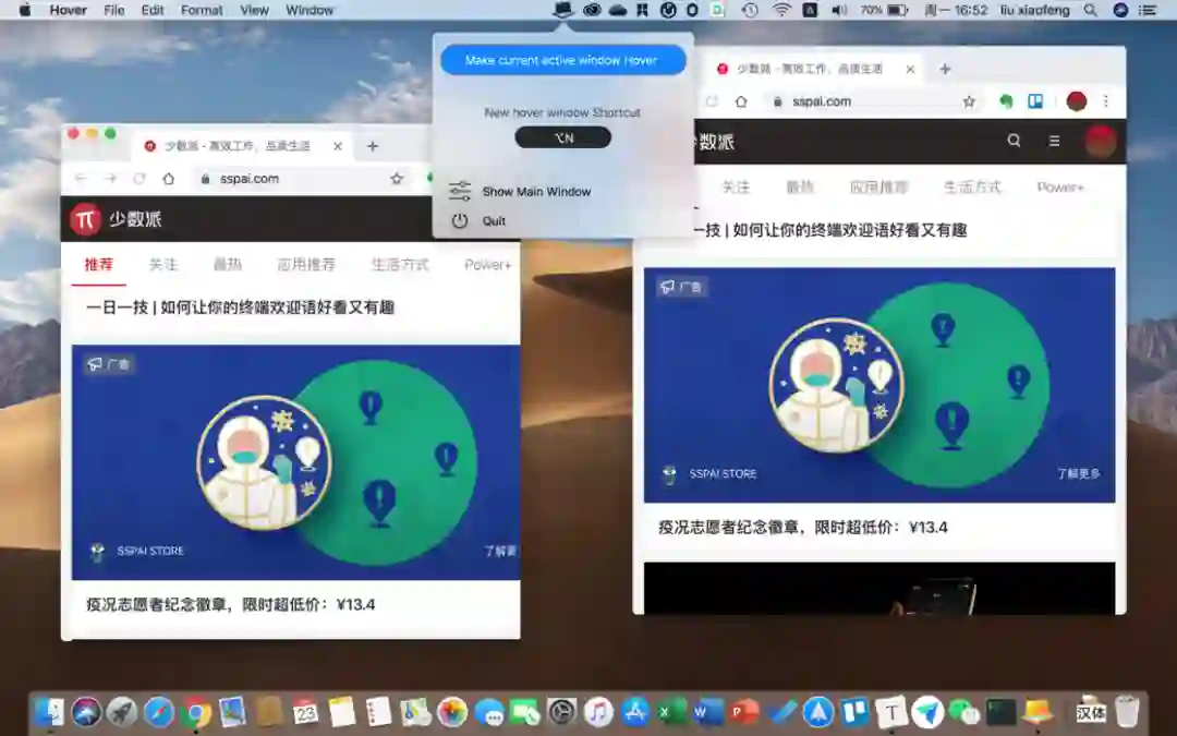 👨🏻💻 化学心情下2:有时我们在 Mac 上开启多个软件之后,往往会出现一些经常使用的软件被放在桌面最下面,就会遇到反复窗口的情况,显然在需要高效率的场景下非常不方便。
