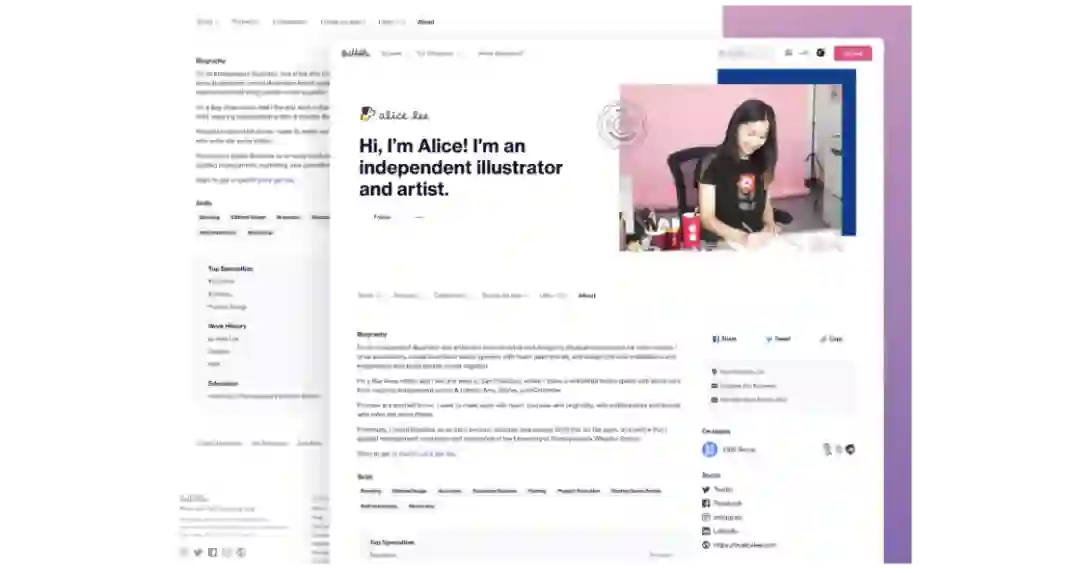 而对于设计师而言,最大的变化可能来自个人主页,对于 Dribbble Pro 用户,新的个人主页可以上传自己的标题图像以及自定义的欢迎文本,让自己的主页看上去更具个性,而在「关于」部分则对个人资料进行了统一,可以非常方便地展示你的简历信息。