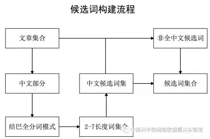 给定若干用户文档(博客或帖子),参赛者需要为每一篇文档生成3个最合适的主题词。要求生成的主题词必须出现在文档中。该任务的难点在于内容主题词是一个相对开放的空间域,候选词集合的范围非常大,与此同时主题词的生成不同于常见的机器学习场景,无法直接应用传统的分类/回归模型。如何在这样开放的候选词中生成文章对应的主题词并充分利用训练数据的标注信息,是该任务的一大关键点。NASC@ICT团队通过构建高覆盖率、低存储代价的特定候选词集合,将传统的无监督的主题词生成模型转换成一个在特定候选词集合上的二分类问题。特定候选词集合的构建过程如下图所示,最终共构建了301,076个候选词,覆盖达到92%的标注主题词。