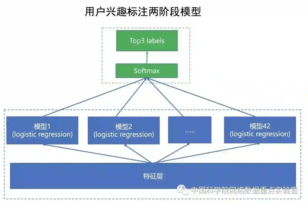 在第一阶段,独立的42个二分类模型并行训练生成,然后将这42个二分类模型的结果作为第二阶段的输入,训练softmax分类器。该两阶段模型在线上测试集达到了44.9%的准确率,有效地解决了训练样本过少,模型容易过拟合的问题。