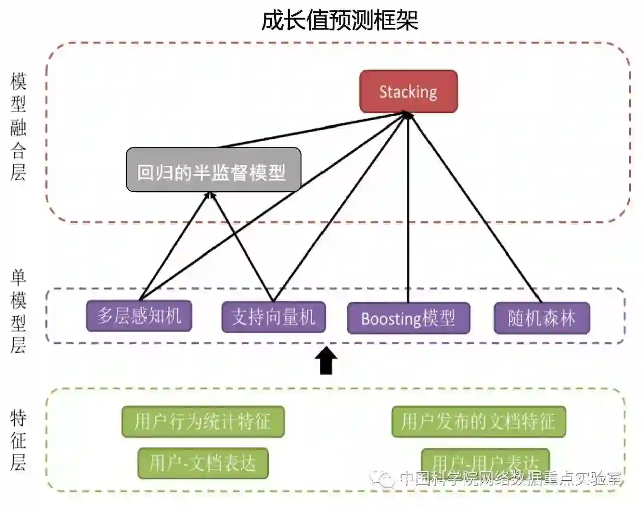 给定若干用户在一段时间内(至少1年)的文档信息(博客或帖子)和行为数据(浏览、评论、收藏、转发、点赞/踩、关注、私信等),参赛者需要预测每一个用户在未来一段时间内(半年至1年)的成长值。如何在CSDN这样一个开放系统下,预测用户未来的行为以及相应的成长值一个非常难的问题。加之带标签数据也较少,用户行为本身就有一定的不可预测性,更使得该任务非常具有挑战性。NASC@ICT团队提出通过回归的半监督模型+Stacking框架来增加带标签数据,解决标注数据过少的问题,增强模型的泛化能力。同时,提取了包括用户行为、用户发布的文档、用户表达等多种维度包含多种信息的特征,来捕获开放系统下的众多影响因素。模型的整体框架如下图所示。最终模型在线上验证集的成绩为0.76,在为期30天的比赛赛程中一直占据排行榜首位。