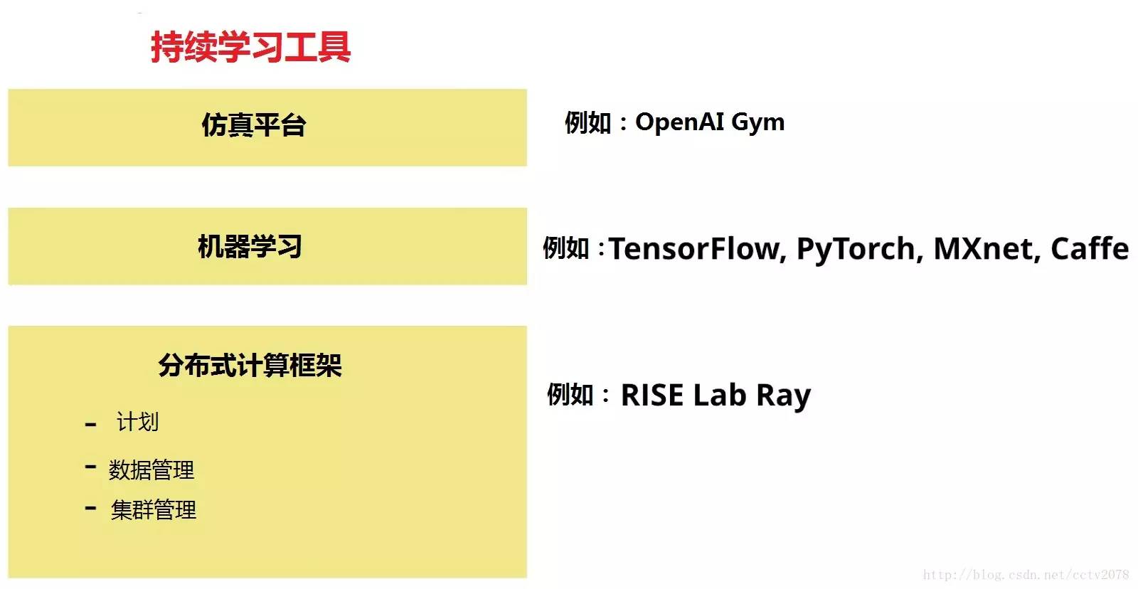 为什么需要一个机器学习库,什么样的算法对持续学习重要?回想一下,在RL中,需要学习如何将观察和量度映射到一组动作上,同时试图最大化一些长期回馈。最近RL的成功案例主要使用基于梯度的深度学习,但是研究人员发现了其它的优化策略,比如推演可能会有所帮助。与监督学习不同,你是从训练数据和客观目标开始,在RL中仅有稀疏的反馈,因此像神经进化的技能,随着经典的梯度学习下降而变得更有竞争力。还有其它相关的算法,可能成为用于持续学习模型标准集合的一部分(例如,最近应用于扑克牌游戏中最低限度减少悔牌的可能性)。Ray的创建者正在收集一个库,这个库实现一组共同的RL算法,它通过一个简单Python API的函数变的更容易使用。