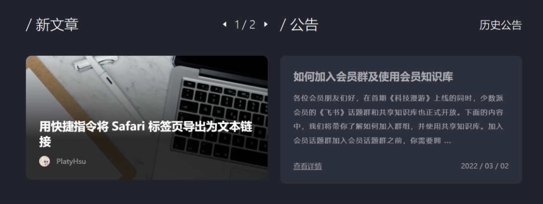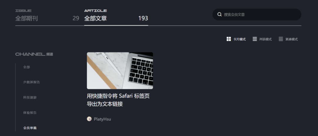 在新功能上线后,《科技漫游》已经发布了首个单篇文章《用快捷指令将 Safari 标签导出为文本链》,你可以在会员中心首页的「新文章」版块中看到,也可以通过「全部文章」的单篇文章筛选查看它。