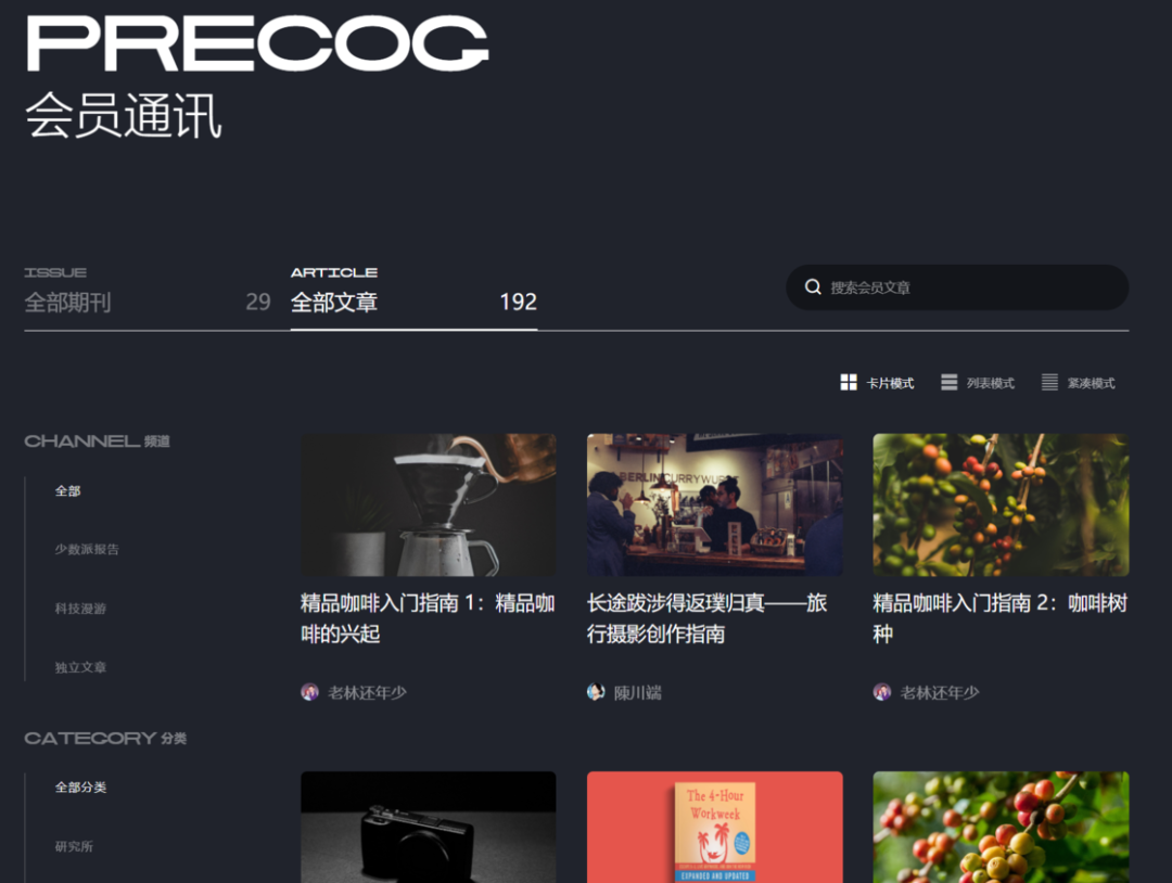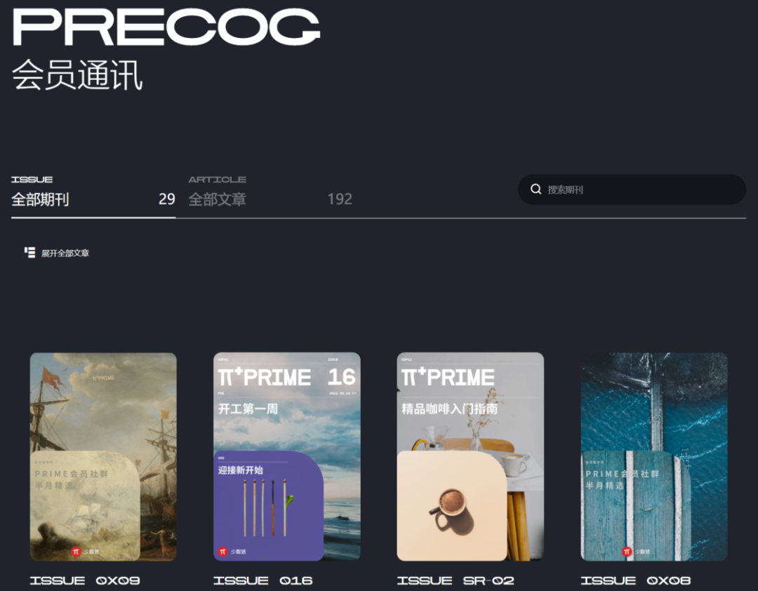 随着单篇文章功能的到来,我们也一并改进了文章的展示方式,且支持搜索和分类筛选。在会员中心的会员通讯版块内,可以查看往期的全部期刊和文章列表。在「全部文章」的标签栏下,所有文章都以单篇形式展示,你可以根据类型来筛选文章,也可以使用会员文章专用的搜索框,根据关键字查找需要的内容。