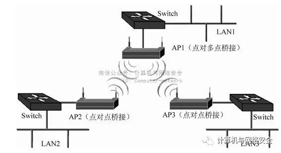 点对多点桥接模式下,网络架构包括多个无线AP设备。其中一个AP为点到多点桥接模式,其他AP为点对点桥接模式。一般用于在一定区域内,实现多个远端点对一个中心点的访问,将多个离散的远程网络连成一体。点对多点模式的连接示意图如图18所示。