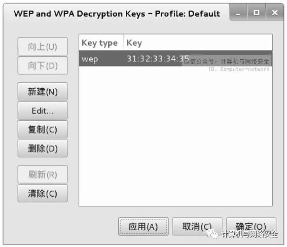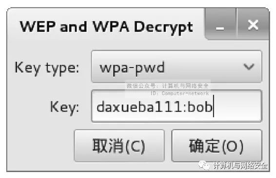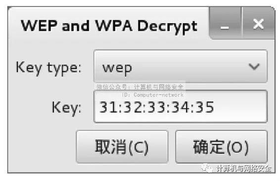 (5)在该界面的Key type文本框中选择密钥类型,该工具支持的类型有wep、wpa-pwd和wpa-psk。因为本例中WiFi使用的是WEP加密的,所以选择加密类型为wep。然后在Key对应的文本框中输入密码,这里输入的密码格式为十六进制的ASCII码值。本例中的密码是12345,对应的十六进制ASCII码值为31、32、33、34、35。所以,输入的密码为31:32:33:34:35,这些值之间也可以不使用冒号。设置完成后,单击确定按钮,将显示如图9所示的界面。
