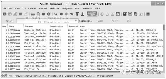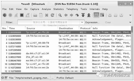 (2)启动Wireshark工具,并选择mon0接口开始捕获数据包,如图11所示。