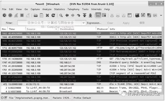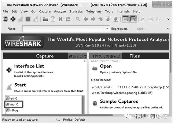 (3)在该界面选择捕获接口。这里需要选择mon0接口,如图1所示。然后单击Start按钮,开始捕获数据包,如图2所示。