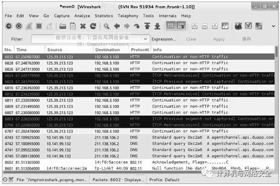 (7)从该界面可以看到各种协议的包,如HTTP和DNS。本例中,客户端的IP地址为192.168.3.100。所以,在该界面的前几个包都是服务器响应给客户端的包。