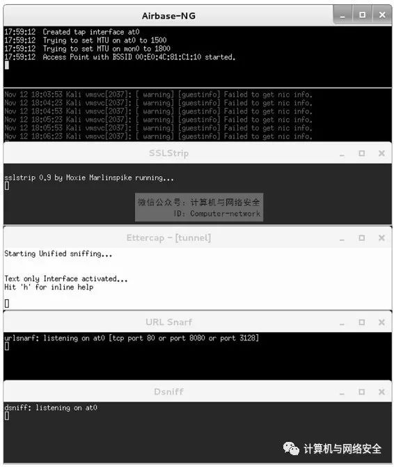 设置完以上的信息后,系统将会自动启动一些程序。如DHCP服务、SSLStrip、Etterp和Dsniff等。几秒后,将会打开几个有效窗口,如图20所示。