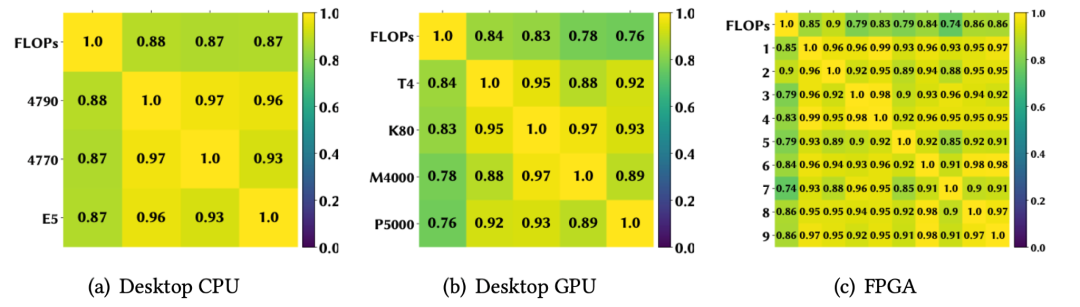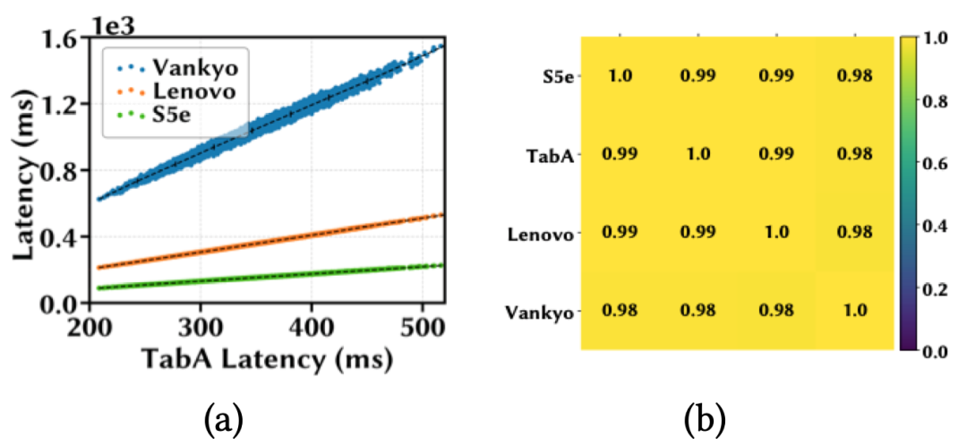 下图(a)用散点表示这些模型在四个设备上的推理延迟;图(b)用热力图来可视化设备之间模型延迟的相关系数,每个方格的颜色深浅和所标数值直观地表示一对设备间的SRCC大小。