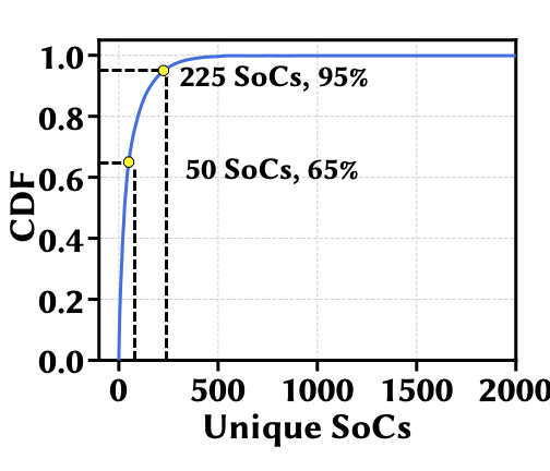 更复杂的是,CNN部署的目标设备极其多样化,包括移动CPU、ASIC、边缘设备、和GPU等。例如,光是移动设备,市面上就有两千多个SoC,排名前30的SoC才勉强各有超过1% 的份额。所以,如何在极其多样化的目标设备上有效地进行硬件适配NAS已成为一项挑战。