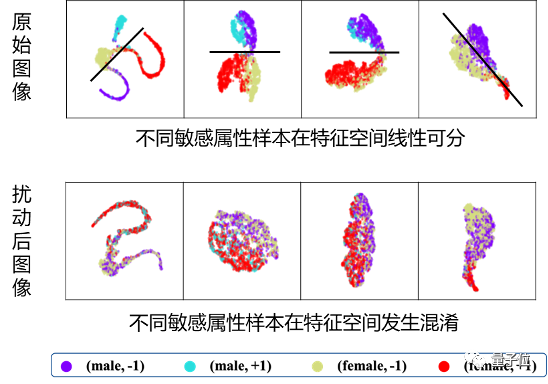 使用T-SNE处理模型特征空间的输出,可以发现,带有性别偏见的模型,在特征空间能分辨出原始图像中不同性别的样本,因而区别对待不同性别的人群。相比之下,该方案让具有不同敏感属性的样本在特征空间发生混淆,使得它们被模型公平对待: