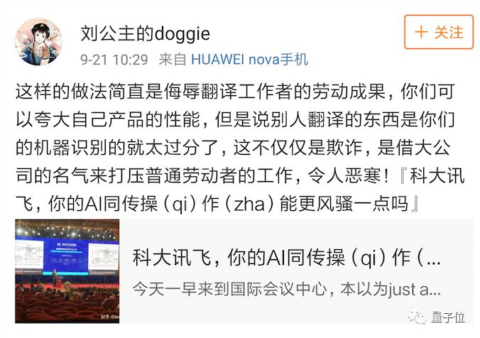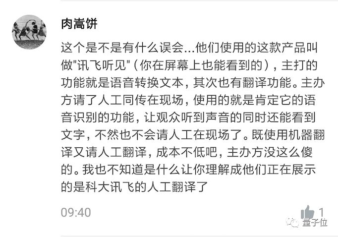 Bell同学声明,科大讯飞事前没有告知他和搭档会场有语音识别的字幕,也没有告诉他们直播的同传是机器朗读二人翻译文稿,没有征得二人同意就冒名使用了他们的翻译成果,有侵犯知识产权的嫌疑。