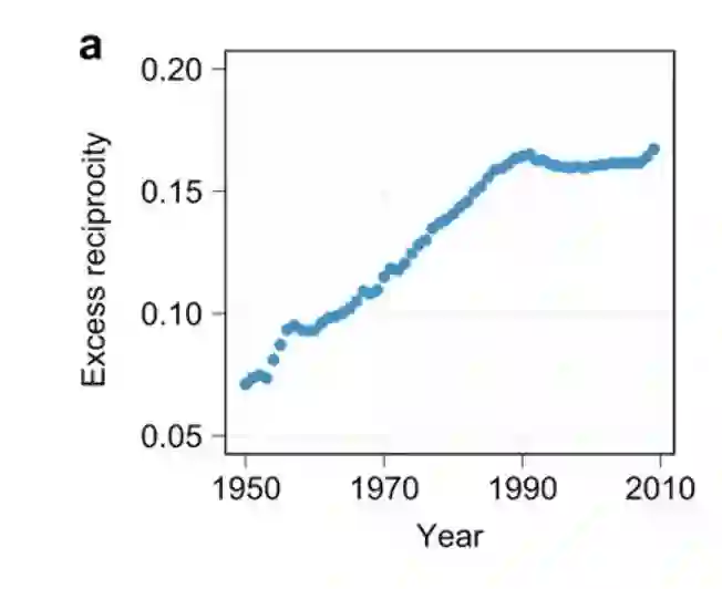 根据历史数据分析,1950 年-1990 年间,互惠引用现象存在一个稳定且持续的上升。在此之后的 20 年内一直稳定在 ρ0=0.15 这个值附近。