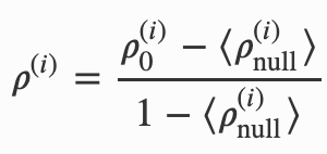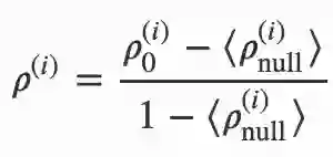 真实的互引网络被与一个经过随机化的基准化假想互引网络做对比,相当于减去正常互引的影响,最终得到的结果就是额外互引(excess reciprocity),用字母 ρ 来表示。如图所示,其中 ρ0 表示科学家在现实网络中的互引得分,ρnull 是科学家在假想互引网络中的得分。这个数值可以衡量某个作者的互引量多大程度超出了正常的范围。