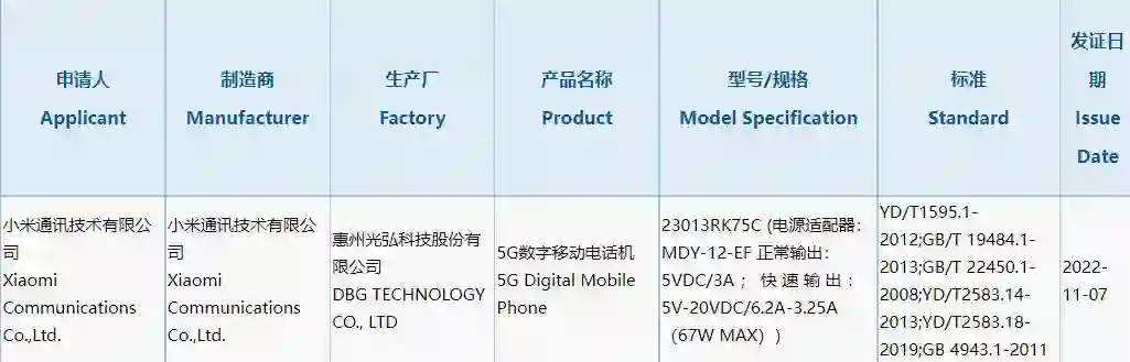 小米 Redmi K60 标准版昨日通过国内 3C 认证,型号为 23013RK75C,充电器型号为 MDY-12-EF,支持最高 67W 快充。据此前爆料,Redmi K60 标准版预计将搭载天玑 8200 芯片,这款手机还将采用带有光学防抖 OIS 的 4800 万像素摄像头,且配备 QHD + 分辨率的采用国产护眼柔性直屏,采用居中打孔。