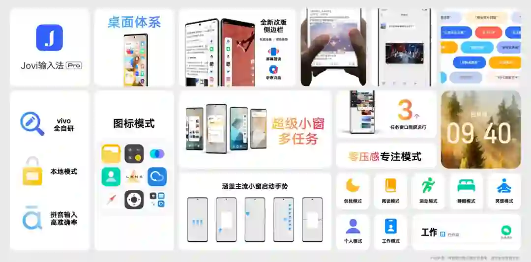其他方面,OriginOS 3 搭载了 vivo 自研输入法 Jovi Pro,数字车钥匙适配特斯拉 Model 3、Model Y、小鹏 G9 等,在人文关怀上升级了 vivo 听说、无障碍通话和声音识别等。